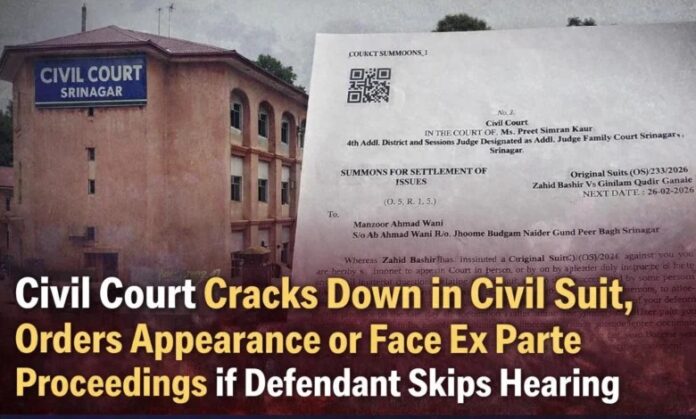 As per the court order, the defendants, Manzoor Ahmad Wani of Jhoome Budgam, Naider Gund Peer Bagh Srinagar, Rehana Farooq and her husband Farooq Ahmad of Budgam have been directed to appear in person or through a duly instructed pleader on February 26, 2026 at 10:30 am to respond to the claim.