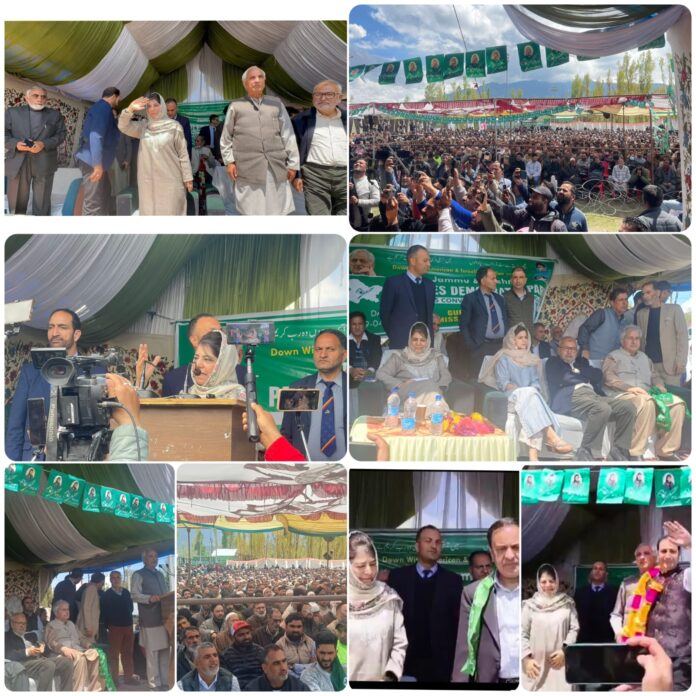 Kulgam, April 9: In a show of unprecedented public enthusiasm, thousands of people gathered in Kulgam to warmly welcome former Chief Minister of Jammu & Kashmir and President of the Jammu & Kashmir Peoples Democratic Party (PDP), Mehbooba Mufti, during her visit today. The massive turnout reflected strong public support and renewed energy among party workers and supporters.