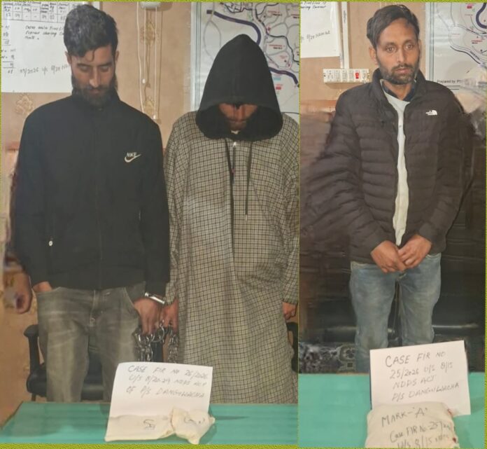 Sopore, April 09, :Continuing its sustained drive against the drug menace, Sopore Police apprehended three drug peddlers in two separate incidents under the jurisdiction of Police Post Watergam and recovered contraband substances from their possession